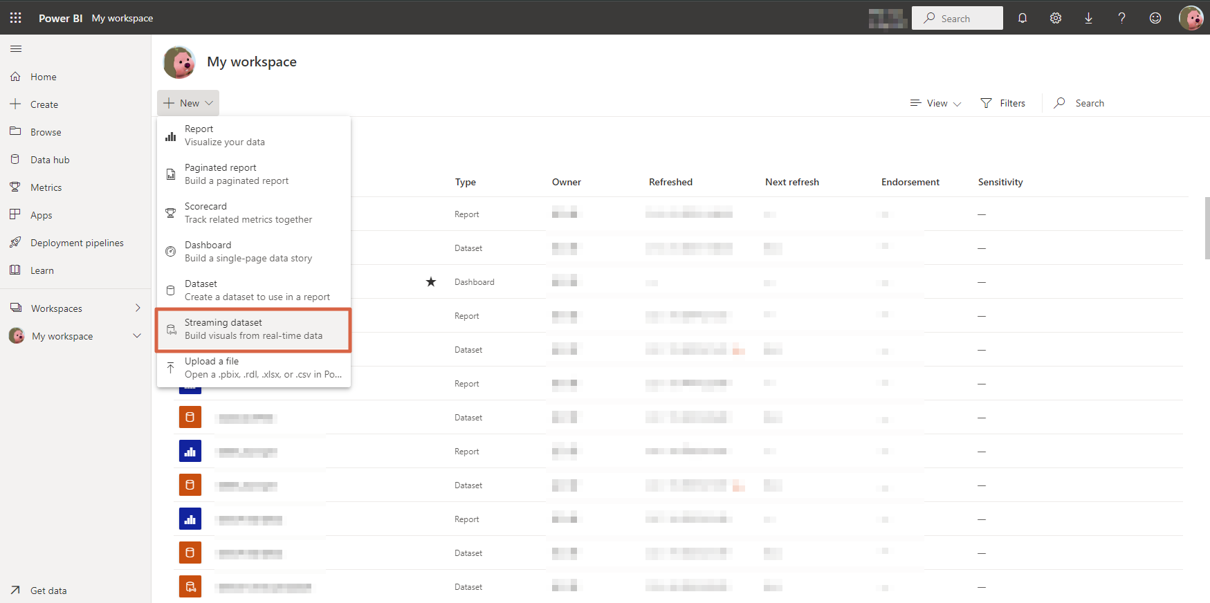 이 Streaming dataset은 Power BI Service에서 만들 수 있습니다.