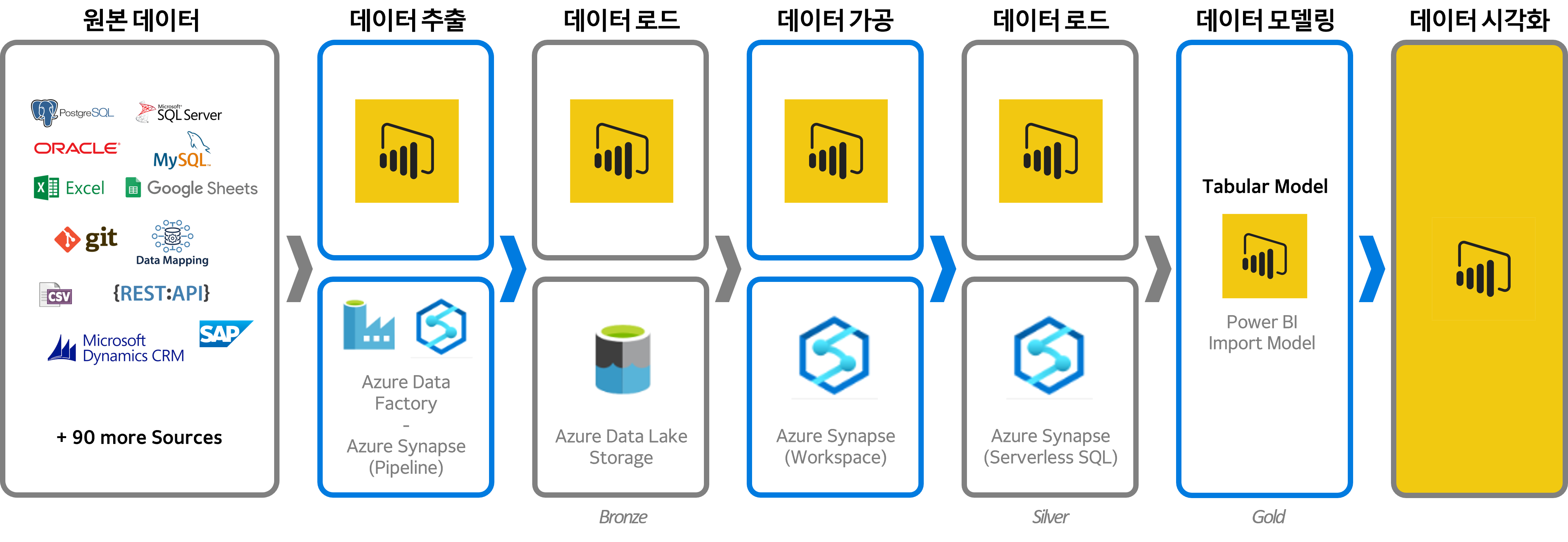 우선 위 그림을 간단히 설명하자면, 추출부터 마지막 로드까지를 오직 Power BI로만 처리한 방법과 Azure를 사용한 방법으로 나뉩니다. 구분 기분은 구축 규모죠. Power BI로만 구성된 흐름은 Self BI에 적합하며, Azure를 사용한 흐름은 엔터프라이즈 규모에 적합합니다.
