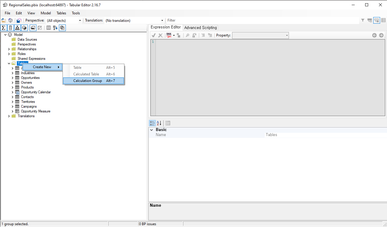 2. Tabular Editor에서 calculation group(measure table) 및 item(measure) 생성