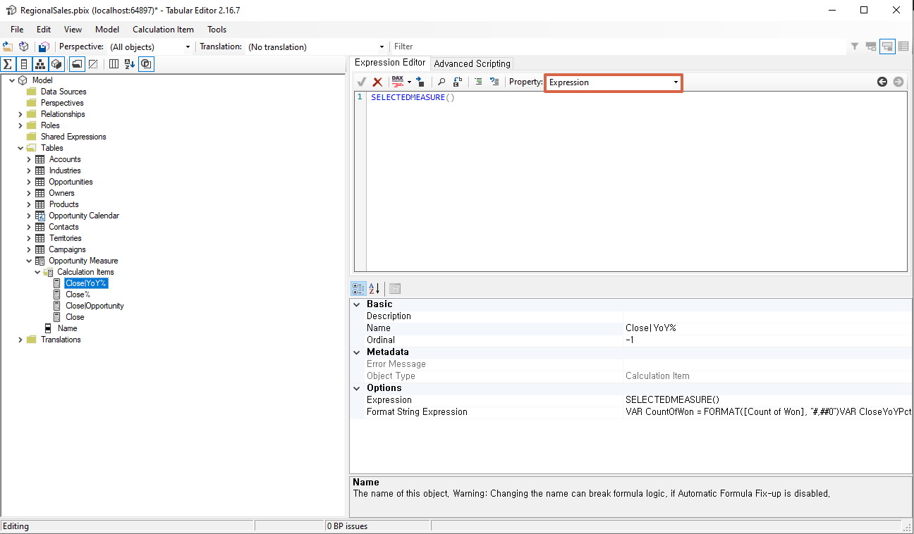 Power BI Desktop에 Tabular Editor에서 생성한 calcation group, 즉 measure 테이블이 되어야합니다.