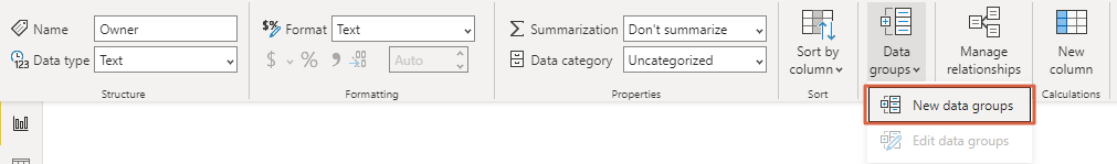 선택한 후 리본 메뉴를 확인하면 [Data groups] 라는 메뉴를 확인 할 수 있습니다. 해당 메뉴를 선택하여 [New data groups] 라는 메뉴를 선택합니다.
