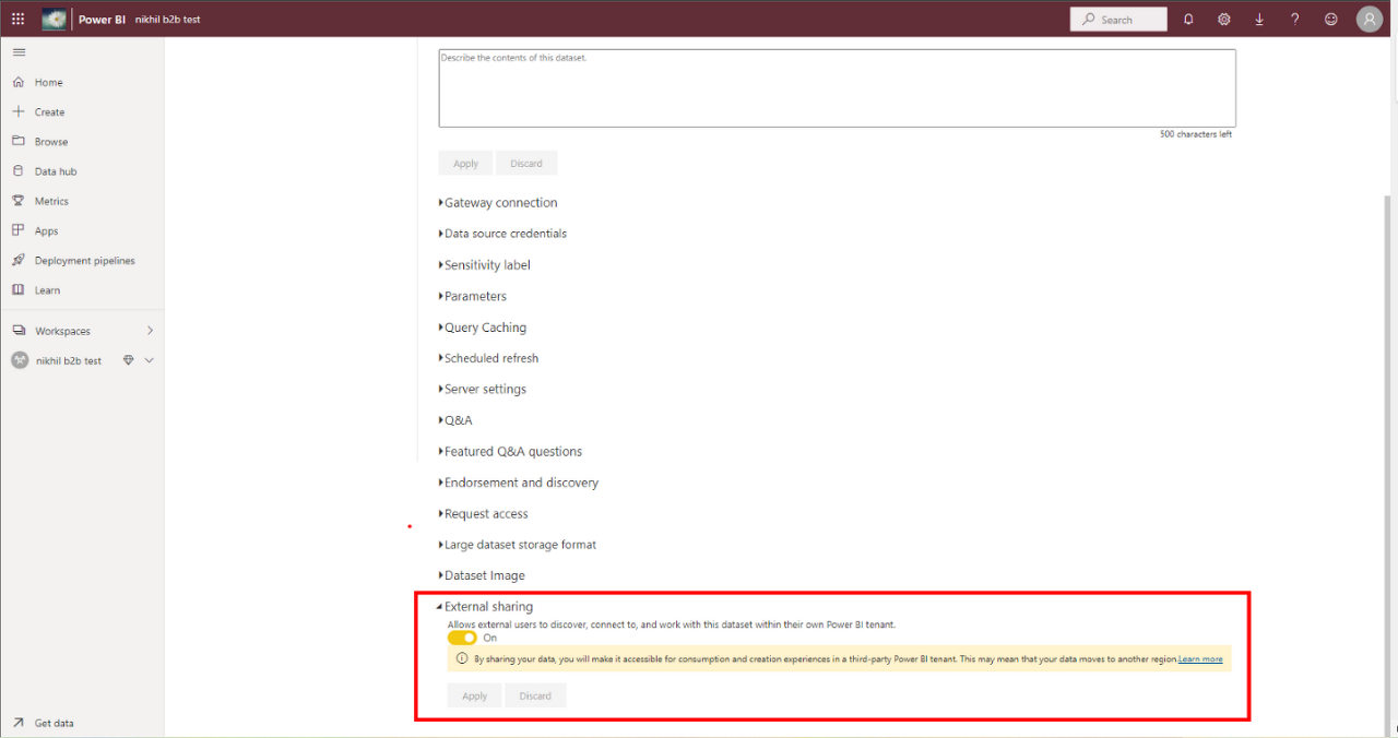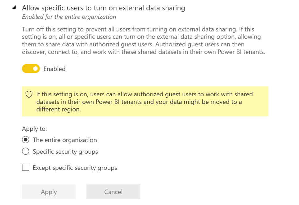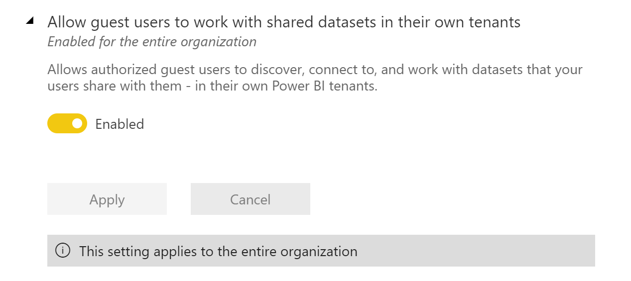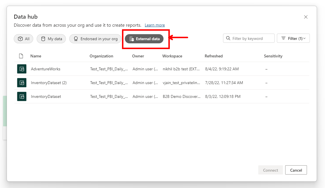 동일 테넌트안에 있는 사용자들 끼리만이 아니라 테넌트 외부 사용자들(external users/consumers)한테도 데이터셋을 공유 할 수 있습니다.(아직 보고서까진 안됩니다.)
